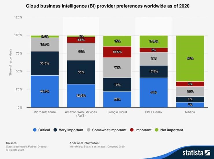 数据显示,从 AWS、谷歌云、阿里云、IBM BlueMix 等主要云服务商提供的 BI 服务,有 96.5%的被调研企业更喜欢 Microsoft Azure BI。