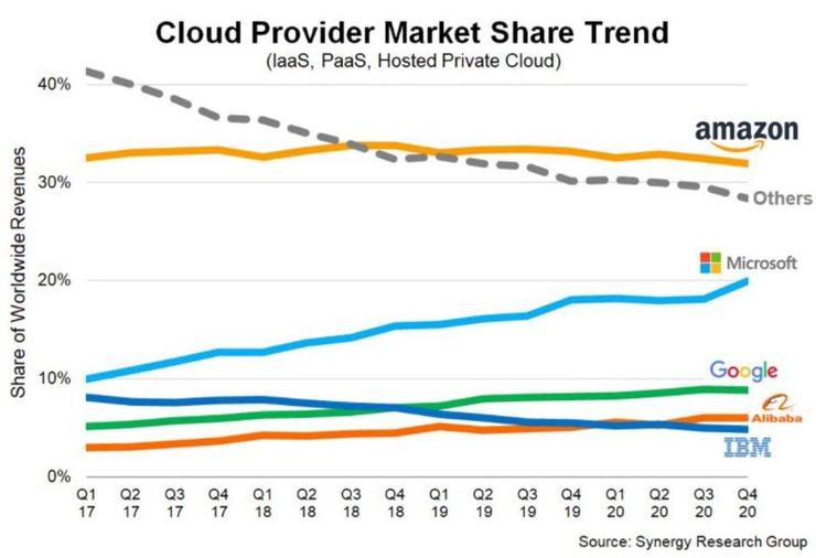 2、调研机构 Synergy Research 最新云市场分析发现,亚马逊云和微软云共占总市场份额的 50% 以上,而微软云首次达到了 20% 以上。