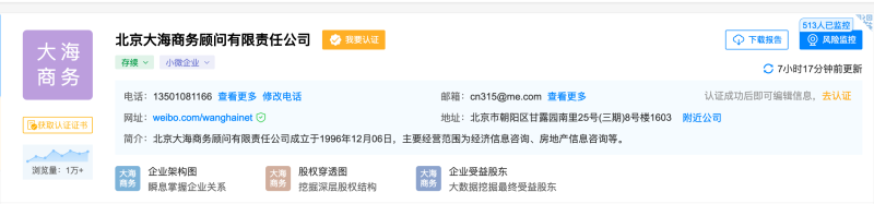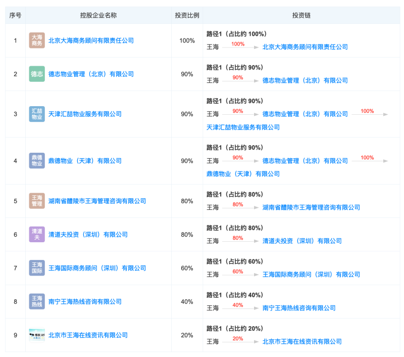 其中100%控股的为北京大海商务顾问有限责任公司,该公司成立于1996年,也是王海最早成立的打假公司,业务范围包括经济信息咨询、房地产信息咨询;劳务服务;技术开发、转让、培训、咨询、服务;市场调研等。