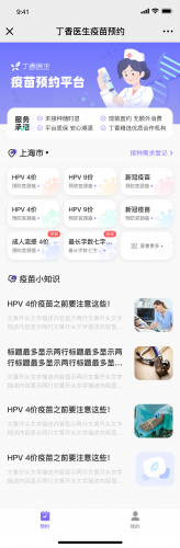 根据官方的介绍,目前,丁香医生疫苗服务平台已经上线HPV、流感、带状疱疹等多种疫苗的接种服务,用户可通过丁香医生旗下公众号(丁香医生、丁香妈妈、丁香医生+)、丁香妈妈app、丁香家微信小程序等丁香系入口登陆,点击“疫苗预约”即可查询就近的接种点并完成在线预约。用户在线上预约完成后,由线下具有接种资质的诊所承接完成接种及接种后的不良反应处置服务。