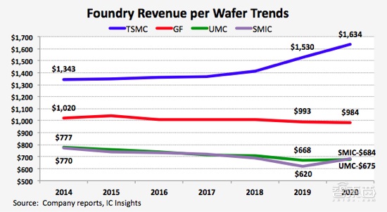 据半导体市研机构 IC Insights 最新报告,2020 年台积电每片晶圆均价达到 1634 美元,超过同期格芯、中芯国际晶圆均价的两倍,创下历史新高。
