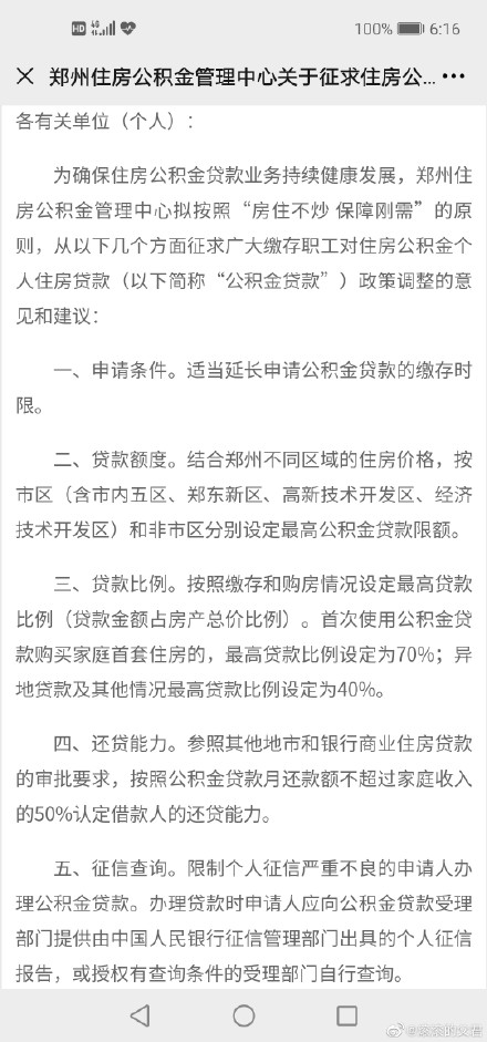 郑州住房公积金管理中心发布关于征求住房公积金个人住房贷款政策调整意见和建议的通知。除适当延长申请公积金贷款的缴存时限以外,调整内容还包括,结合郑州不同区域的住房价格,按市区和非市区分别设定最高公积金贷款限额。通知还提出,按照缴存和购房情况设定最高贷款比例(贷款金额占房产总价比例)。首次使用公积金贷款购买家庭首套住房的,最高贷款比例设定为70%;异地贷款及其他情况最高贷款比例设定为40%。
