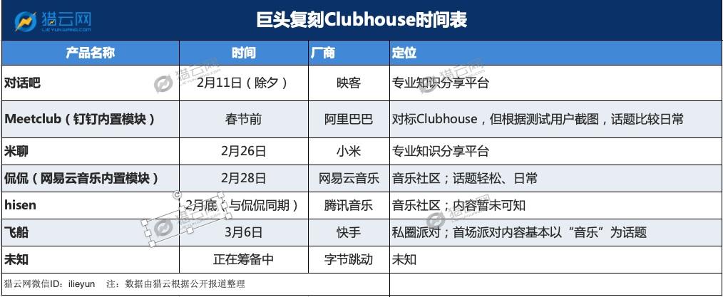 猎云网整理了巨头们推出复刻版 Clubhouse 的时间表,可以说,这一次的 “抄作业”,比以往任何一次都要凶猛,速度之快、执行力之强令人咋舌,其背后也体现了众多创投人士对社交赛道的密切关注与期待。