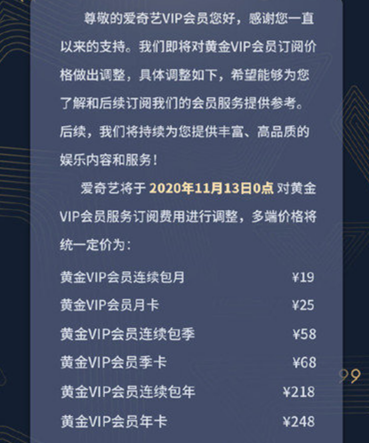 11月6日,爱奇艺宣布对黄金VIP会员服务订阅费用进行调整,涉及连续包月、月卡、连续包季、季卡、连续包年、年卡,九年不变的19.8元变成了25元。