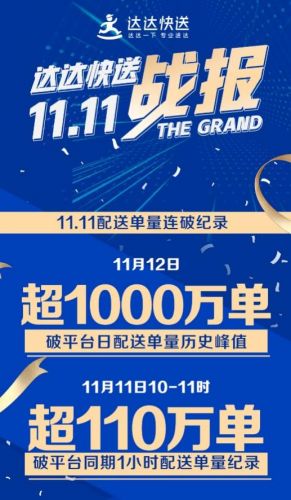 【6cu.com】11月13日消息,达达集团旗下本地即时配送平台达达快送发布11.11物流战报:11月12日,平台日配送单量突破1000万,创下平台峰值新纪录。11日10-11时,平台配送单量超110万,破平台同期1小时单量峰值纪录。11月1-12日,平台整体配送履约率达99%以上。