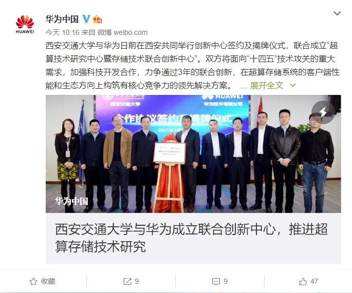 3 月 9 日消息 西安交通大学与华为技术有限公司(以下简称 “华为”)在西安联合成立 “超算技术研究中心暨存储技术联合创新中心”。