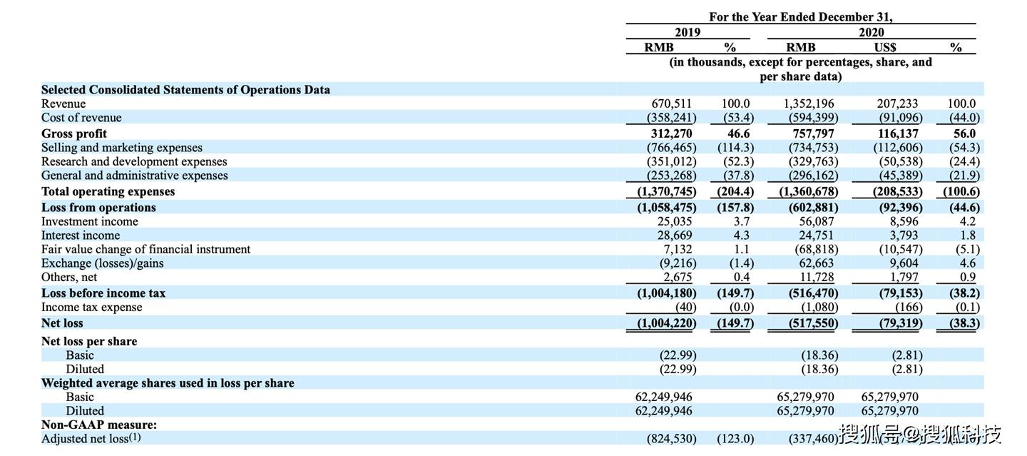 据招股书显示,知乎 2019 年、2020 年的营收分别为 6.71 亿元人?币和 13.52 亿元人?币,同 比增?达 101.7%。2020 年毛利率 56%,2019 年毛利率 46.6%,同比增? 20.2%。但与此同 时,亏损缺口也很大,知乎 2020 年净亏损 5.18 亿元人?币,2019 年净亏损 10 亿元人?币,同比收窄 48.2%。