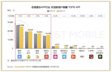 另据 QuestMobile 的最新报告显示,在 2020 年 12 月的在线音乐 App 用户规模 Top10 中,网易云音乐也排在了第四名,略低于酷我音乐。