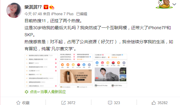 在得知自己成功凭借凡尔赛制霸热搜后,蒙淇淇在微博中发表了如下感言: