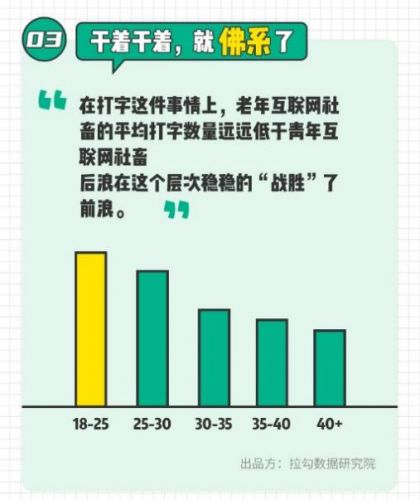 “后浪”们的朝气蓬勃,也体现在打字上。报告显示,年龄越大的社畜,打字越少。工作越久,沟通越言简意赅,当然也可能是越“佛系”,