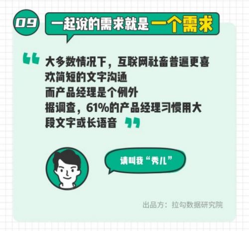 另外,大多数情况下,互联网社畜普遍更喜欢简单的文字沟通,而产品经理是个例。据调查,61%的产品经理习惯用大段文字和长语音。