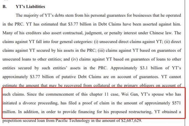 贾跃亭个人破产重组申请的其中一份文件 今年1月,贾跃亭方面披露的一份声明显示,在贾跃亭提出破产重组以后,已申请离婚的甘薇向贾跃亭提出了接近5.71亿美元(约合人民币39.83亿)的索偿。