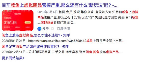得知受骗的彭先生,曾在某搜索引擎搜索 “闲鱼”和 “虚拟商品”的关键词,发现搜索引擎上面充斥着 “闲鱼卖虚拟商品日入 300”字样的链接,一些经验贴,甚至详细介绍如何在闲鱼上架虚拟商品,如何虚拟上货。