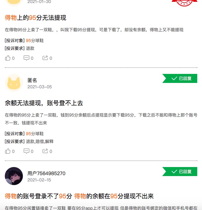 近日,多名卖家在黑猫平台投诉,称在得物电商平台卖出去鞋子,需要下载并登录二手电商 App“95 分球鞋”才能提取,但当下载该 App 后,显示新账户并无存款。