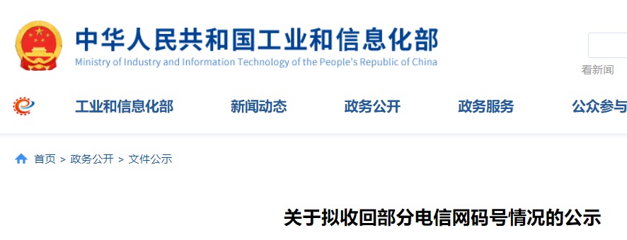 公示指出,为保护用户利益,增强电信网码号资源管理工作的透明度和公正性,现对拟收回的电信网码号进行公示,公示时间截止到 2021 年 4 月 8 日。公示期满后,将启动码号回收机制,收回相应的电信网码号。