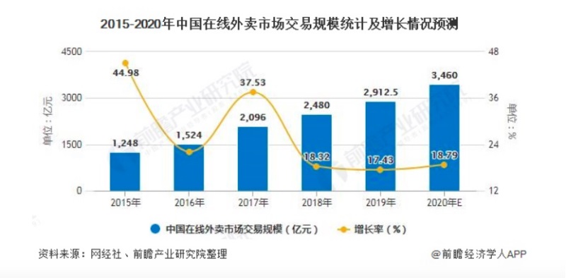 随着外卖用户规模的不断增长,外卖行业的交易规模也保持稳定增长态势。前瞻产业研究院在一份报告中提出,根据网经社数据显示,2019 年我国在线外卖行业的交易规模达 2912.5 亿元,同比增长 17.43%,预计 2020 年行业交易规模将达 3460 亿元,同比增长 18.8%。