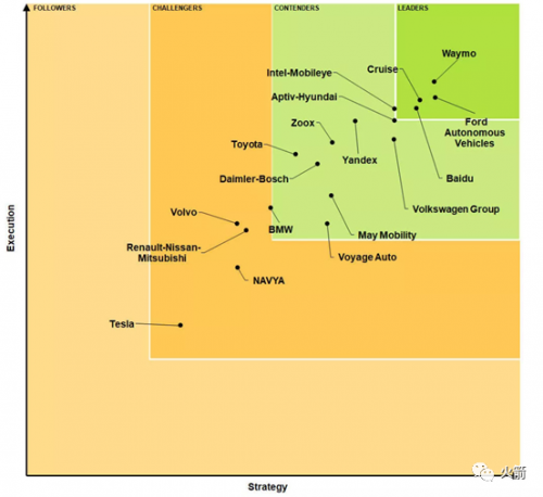 图:知名研究机构Navigant Research (以下简称NR) 发布最新自动驾驶竞争力榜单。2020年,唯一上榜的中国玩家百度Apollo排名再次跃升,首次挺进NR报告国际自动驾驶 "领导者" 行列。参考:www.cheyun.com/content/33713