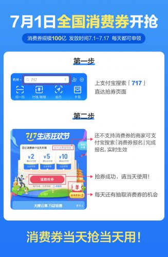 据介绍,现在上支付宝搜索「717」,可设置开抢提醒。这是全国200多城市发放地方版消费券后,全国范围首次发放跨城通用消费券。