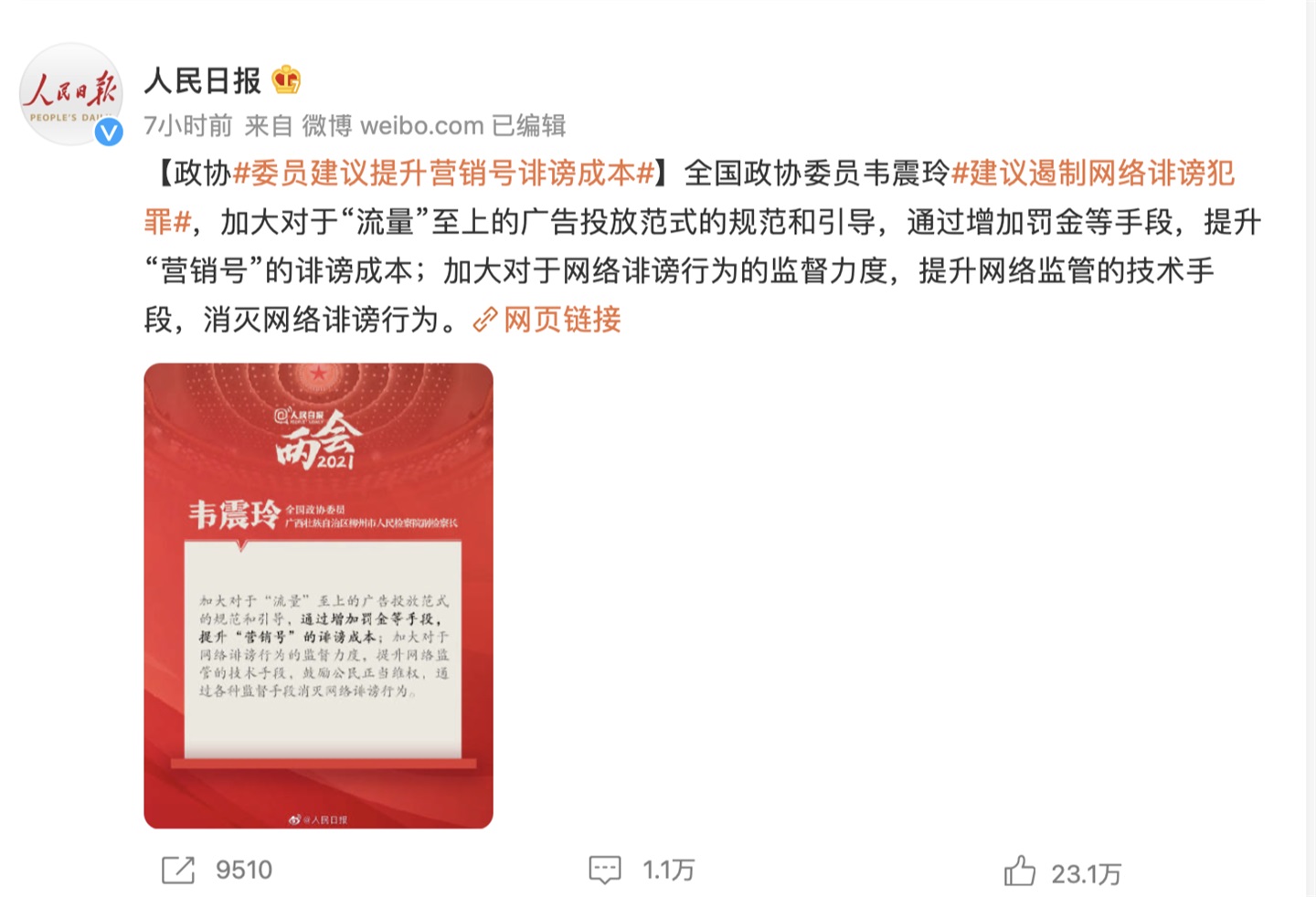 李东生建议,通过立法明确其他社会主体的责任。比如加大网络平台实名制管理;对 “流量”至上的广告投放模式进行规范和引导;提升 “营销号”的诽谤成本等,鼓励公民正当维权。