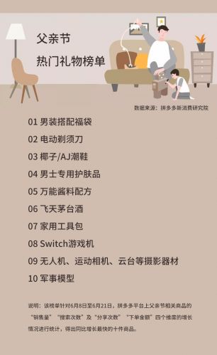 据悉,该榜单对6月8日至6月21日,拼多多平台父亲节相关商品的“销售量”“搜索次数”“分享次数”及“下单金额”四个维度数据的增长情况进行综合统计,得出同比增长最快的十件商品。