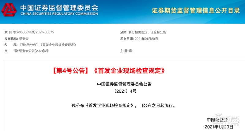 去年 10 月,证监会发布了《首发企业现场检查规定(征求意见稿)》;今年 1 月 29 日,证监会正式下发了《首发企业现场检查规定》(简称《检查规定》)。