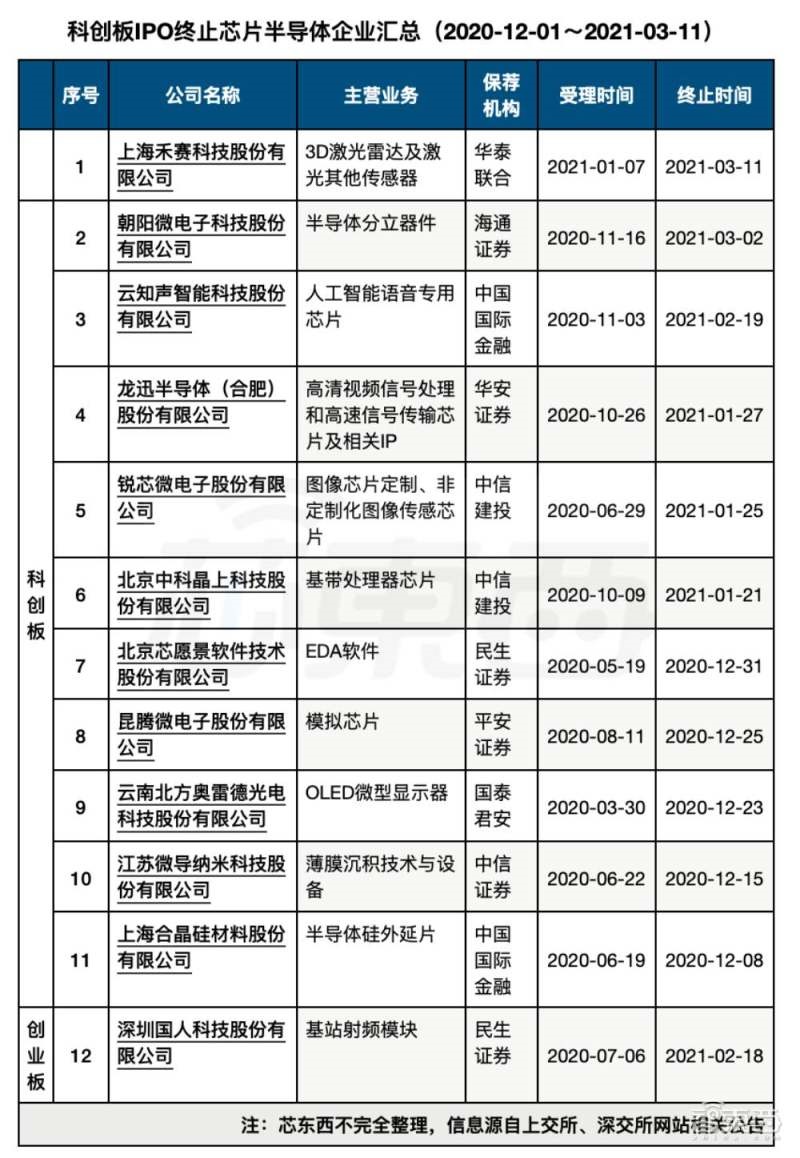 1 月至今,芯东西不完全统计,已有 7 家业务涉及芯片的企业申请终止 A 股 IPO 流程,其中不乏云知声等知名度较高的明星企业。再把时间向前推算,这波 IPO 终止潮从 2020 年 12 月就有端倪。