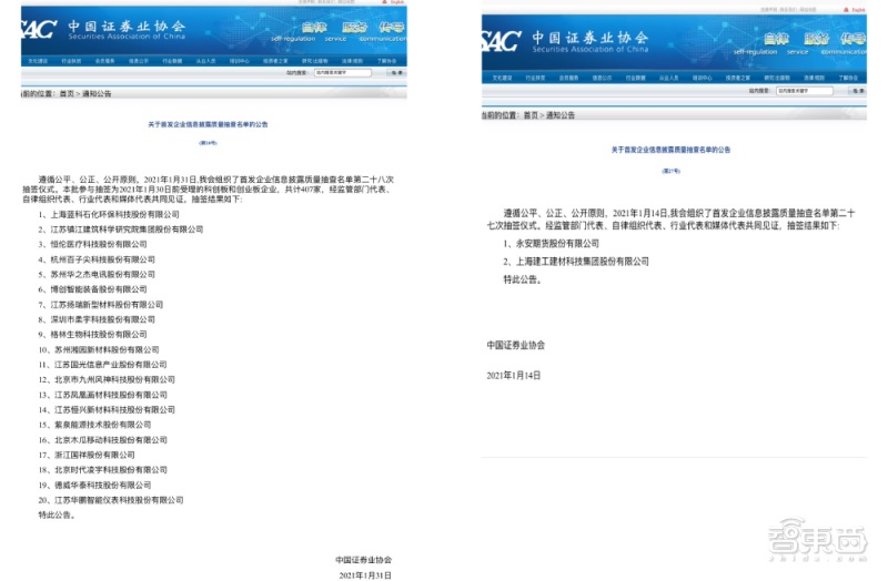 ▲关于首发企业信息披露质量抽查名单的公告。左–第 28 号公告,右–第 27 号公告