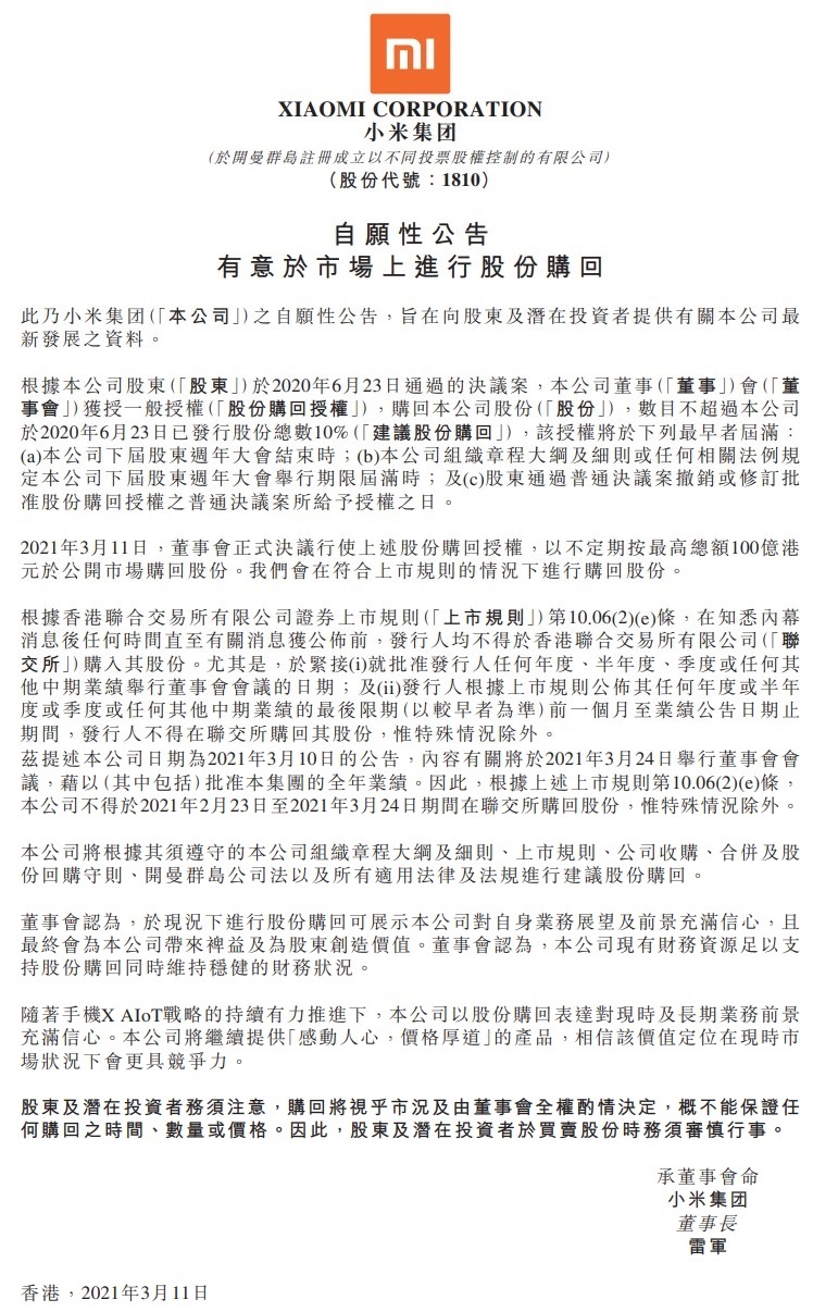 2021 年 3 月 11 日,董事会正式决定行使该授权。由于即将发布 2020 年年度业绩报告,根据上市规则,小米不得在 2021 年 2 月 23 日至 3 月 24 日业绩发布日的期间买卖股份,因此该项股权回购将于禁止买卖期结束后不定期执行。