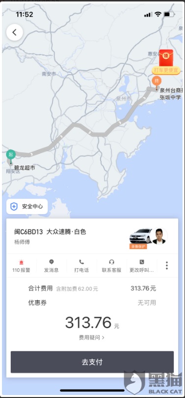 杨小姐认为自己的遭遇很是离奇。3 月 2 日,她的滴滴 App 里出现了一个奇怪的订单。这个订单产生在福建泉州,总费用 313.76 元,但实际上自己却从未去过泉州。