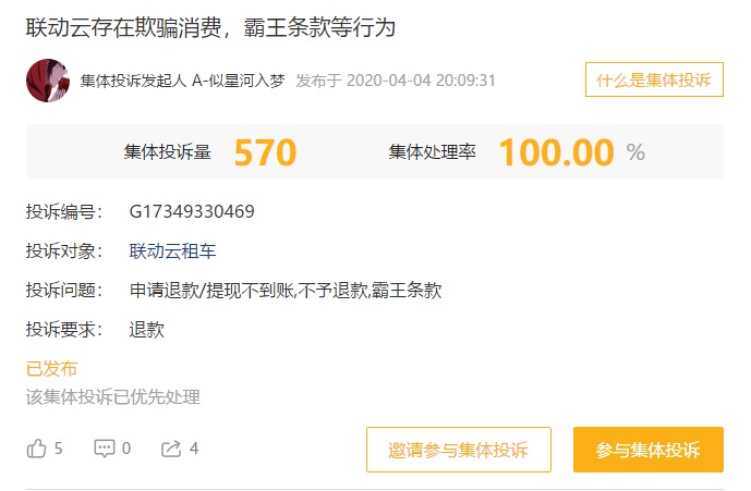 押金问题之外,欺骗消费、霸王条款也是消费者对联动云租车投诉的重点,该问题的集体投诉量达到了 570 个。