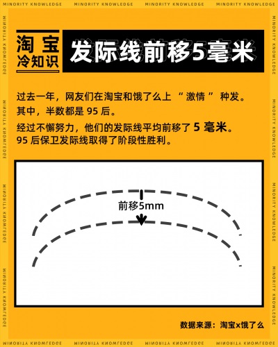 根据测算,在淘宝和饿了么上,被买走的植发套餐足以让网友们的发际线平均前移 5 毫米。扎心的 “发际线后退”在网友的不懈努力中终于变成了 “发际线前移”。