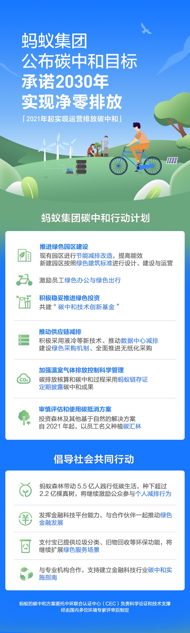 为了实现 2030 年碳中和目标,蚂蚁自身的行动包括:对现有园区进行节能减排改造,提高能效;新建园区按照绿色建筑标准进行设计、建设与运营;建立激励机制,倡导员工践行低碳办公行为;积极稳妥推进绿色投资,共建 “碳中和技术创新基金”等。针对范围三的间接排放,在供应链的碳减排方面,建设绿色采购机制,积极采用液冷等新技术、推动数据中心减排。