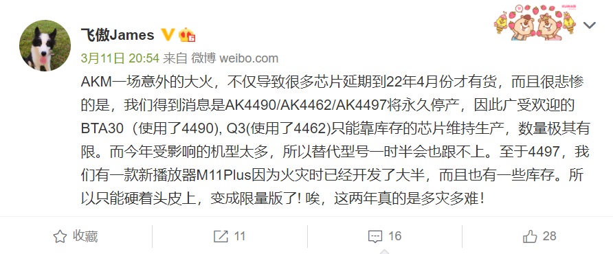 飞傲电子联合创始人 James 昨日表示,日本 AKM 公司生产的 AK4490/AK4462/AK4497 DAC 芯片将永久停产,目前在售的 BTA30、Q3 产品只能依靠库存芯片维持生产,数量极其有限。