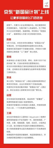 根据京东“新国品计划”,京东将联合全国数十家主流媒体,征集各地因为疫情遇到困难但商品品质有充分保障的中小企业,为这些企业提供一系列支持,助力企业擦亮品牌、拓展销路,推进数字化转型。
