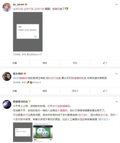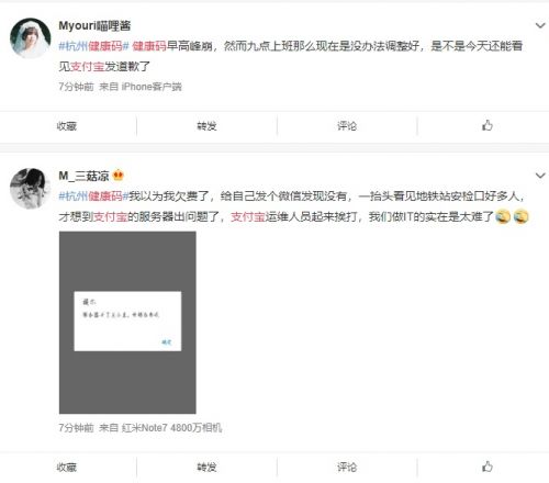 IT之家搜索微博相关内容,还有不少网友表示,支付宝健康码服务异常,大多地区来自杭州。有用户表示:“今天早上上班,进地铁的时候,打开支付宝的健康码。死活都不开,安检的地方一堆的人在刷这个健康码,估计又有程序猿要被拿去祭天了。”