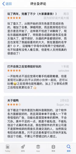 有不少网友还在APP Store的评论区写下与唱鸭的故事:有一开始觉得对着手机唱歌略傻,接触后认为还挺有趣的;有见证唱鸭一路成长,获得陌生人支持很感动的;也有希望开发者增加私信功能的。极具温暖的双向互动,也让用户和平台之间有了相互陪伴成长的良好氛围。