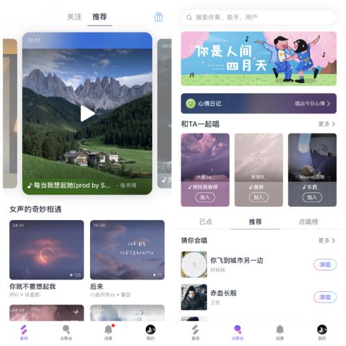 网易云音乐公测的新产品“音街”,主打还是K歌,但相较唱吧和全民K歌,音街在设计上更清新简洁,主要有发现、点歌台、消息、个人中心四个模块。用户可以选择自己唱,也可以与好友合唱;可以对唱完的歌曲进行编辑,也可以用音乐的形式记录生活。整体产品逻辑是以K歌切社区,投年轻人所好。