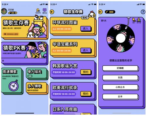 腾讯的猜歌星球,核心玩法则是猜歌,但加入了浓郁的吃鸡游戏基因,主要涉及1V1 PK赛、单人闯关、60s竞速猜歌、6人组局对战四种模式,可以通过各种模式解锁猜歌玩法,通过一直答对才能存活到最后,其实是将以前线下聚会的游戏投射到线上,在饭圈很受欢迎。
