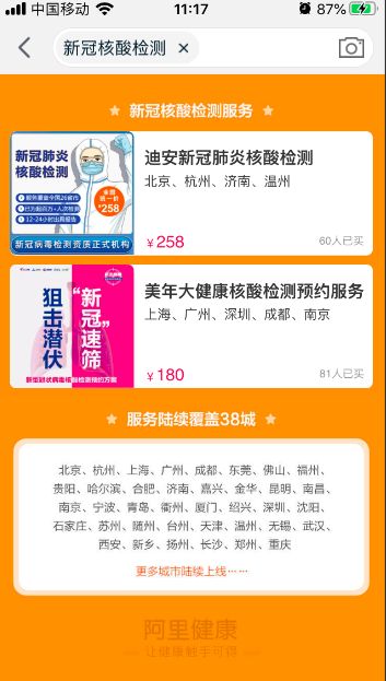 原标题:阿里健康上线新冠核酸检测服务:本周覆盖北京武汉等38城