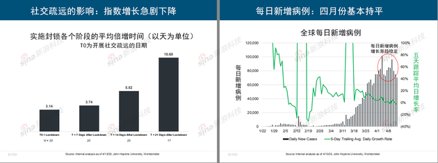 在实施控制措施后,各国在两周内将病例倍增时间延长大约6天,在三周内将倍增时间延长至大约11天。最早进入封锁的国家在实施严格的社交控制大约四周后,即达到了住院率和死亡率的峰值。到了4月份,全世界每日新增病例数已经基本稳定下来,病例数翻番时间进一步延长至15天左右,这表明我们可能已经接近本次病毒爆发的高峰期。
