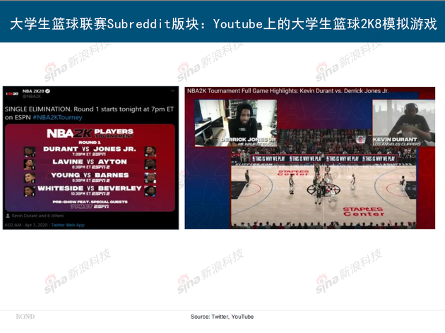 3月11日,作为March Madness 2020的替代,大学篮球subreddit上的120万名成员在游戏College Hoops 2K8上,发起非正式的68个球队的NCAA联赛模拟,并在YouTube上进行直播,比赛结果由游戏中的计算机与计算机对垒决定。