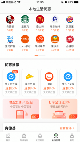 据了解,返利网全新推出的“生活优惠”频道,面向用户免费开放了精选爆款生活权益——汽车加油全场8.5折起,覆盖逾千家门店;摩拜单车30天骑行券低至5.5折,肯德基5折起,星巴克可享8折,点外卖、买菜、打车都能畅享最高5%的返利,可谓吃喝玩乐购,无所不返。