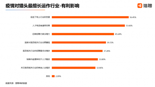 关于疫情对猎头最擅长运作行业的有利影响,得票率排名前三的分别是:促进了线上行业的发展、人才电话接通率变高、后期招聘力度增大,选这三项的猎头分别占到56.45%、53.66%、45.64%。