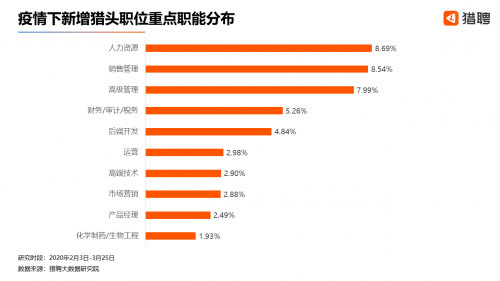 批量性招聘岗位一般可替代性强,高级管理岗位属于高薪阶层,产品研发技术岗位则和产品线强相关,受产品线的影响。在疫情之下,企业会尽量提高人效,严格控制人力成本,同时结合产品线收缩一些效益欠佳的相关岗位,因而这三类岗位的招聘受到疫情的影响较大。