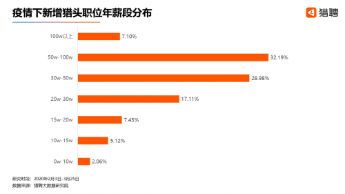 50万-100万、30万-50万年薪的新增猎头职位占比最高,这表明疫情下猎头对于高端人才的需求比较坚挺,这背后是企业对高端人才的需求并未松懈,在疫情这种特殊时期,他们仍愿花高薪聘请高端人才。