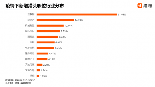 当前疫情下,新增猎头职位在全部大行业均有分布,位居第一的是互联网行业,新增猎头职位占比为31.05%。位居第二是房地产行业,新增猎头职位占比为14.39%;第三为机械制造行业,占比为10.44%。制药医疗行业紧随其后,排名第四,新增猎头职位占比为9.03%。