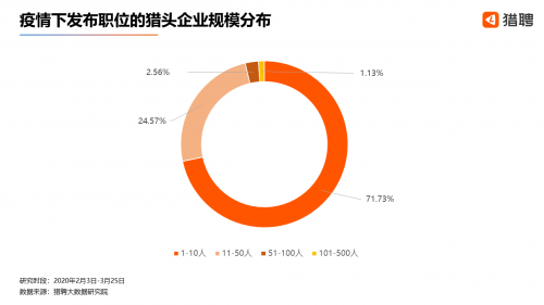 从发布职位的猎头企业规模分布来看,1-10人规模的猎头公司占比最高,为71.73%;其次是11-50人的公司,占比为24.57%;51-100人、101-500人的猎企占比分别为2.56%、1.13%。
