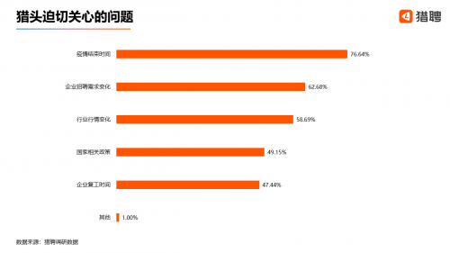 疫情期间,猎头迫切关心的三大问题是:疫情结束时间、企业招聘需要变化、行业行情变化,这个问题的得票率分别为76.64%、62.68%、58.69%。