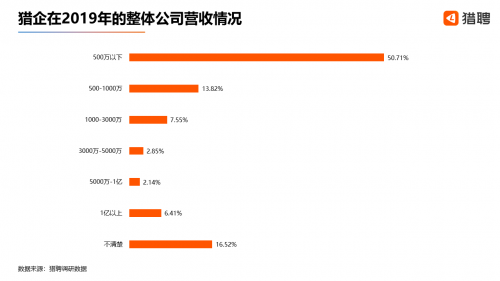 疫情对当下猎头营收的影响是很多人关心的话题。猎头公司的实际营收情况如何?猎聘此次调研显示,50.71%的猎头公司2019年的营收为500万元以下。营收500万-1000万的猎头公司只占到13.82%;营收5000万-1亿的猎头公司只有2.14%。营收额度越高,猎头公司的整体占比越低,营收处于金字塔尖的猎头公司也只是少数。