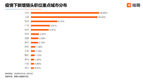 疫情之下,在猎头企业分布的12个重点城市中,上海占比最高,为21.01%;其次是北京,占比为13.92%。
